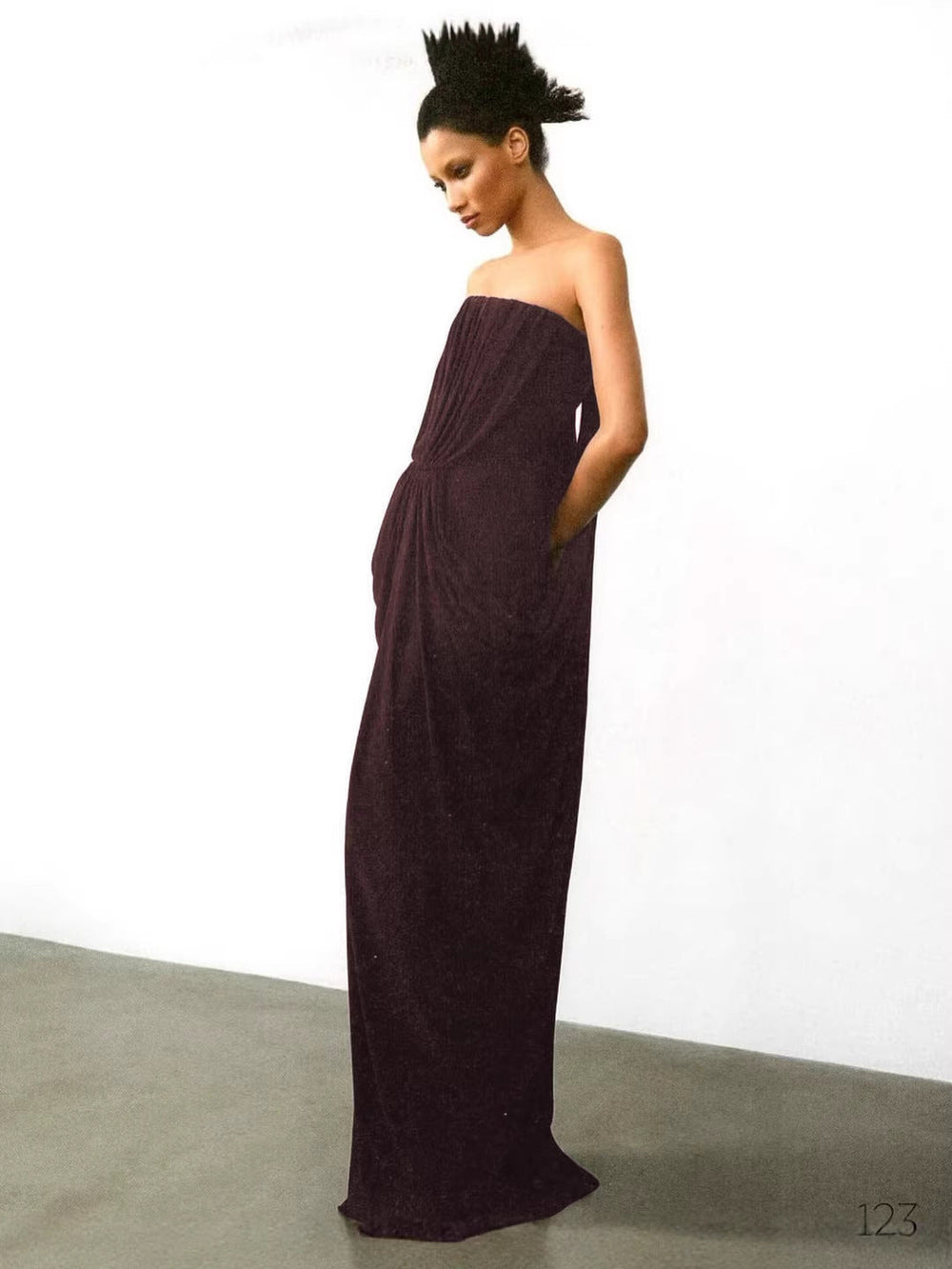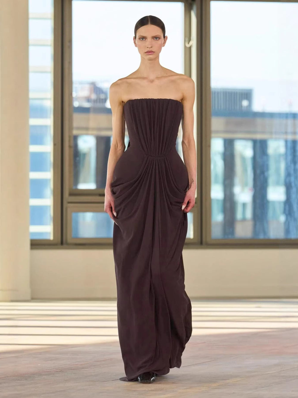 Elevate your evening elegance with this stunning Simona pleated crepe jersey strapless gown in rich brown. The sophisticated strapless neckline and expertly crafted pleated detailing create a refined silhouette that flatters and flows beautifully. Crafted from luxurious crepe jersey fabric, this gown offers comfort without compromising on style. Perfect for formal events, galas, or special occasions where you want to make a graceful impression. The timeless brown hue pairs effortlessly with classic accessories, making it a versatile addition to any formal wardrobe.